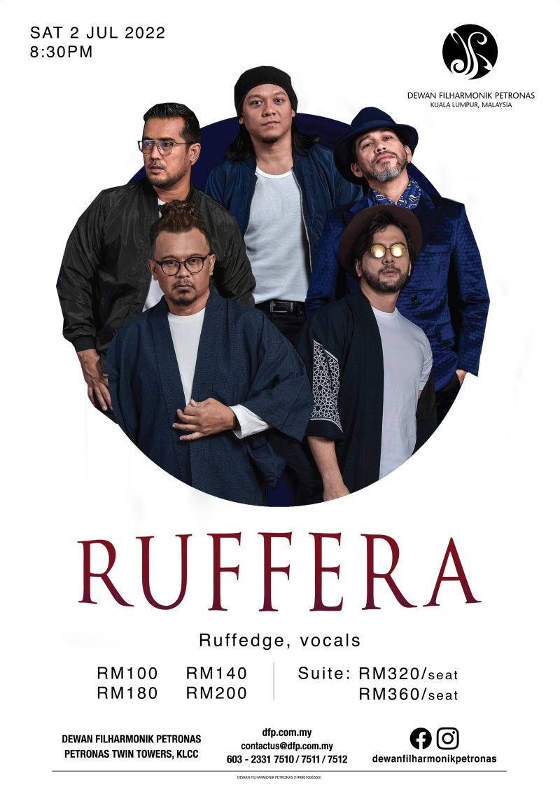 Konsert yang diberi nama “Ruffera” ini bakal dipentaskan di Dewan Filharmonik PETRONAS pada 2 Julai 2022 (Sabtu) dengan harga tiket bermula RM200 sehingga RM360. Untuk tempahan dan info lanjut mendapatkan tiket hubungi 03-23317510 / 7511 /7522 atau melalui emel boxoffice@dfp.com.my