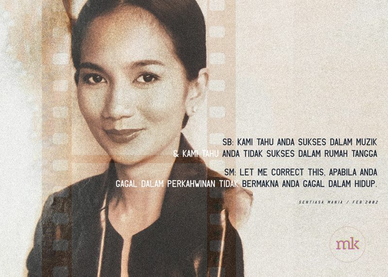 SM: I want to correct this. Apabila anda gagal dalam perkahwinan, ini tidak bererti anda gagal. Jodoh di tangan tuhan. Kita boleh rancang dan usaha tapi kalau tuhan kata tak jadi usaha macam mana pun tak akan jadi. Saya nak orang faham terutama old school people yang selalu point finger kata anda gagal dalam hidup kalau perkahwinan gagal.